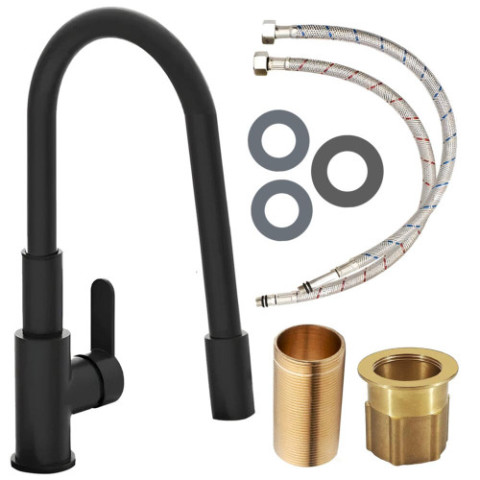 Гибкий смеситель для кухонной мойки с гибким изливом, вращающимся на 360°. Современный дизайн в элегантном черном цвете сочетает в себе функциональность и стиль. Идеально подходит для кухни и обеспечивает комфорт.